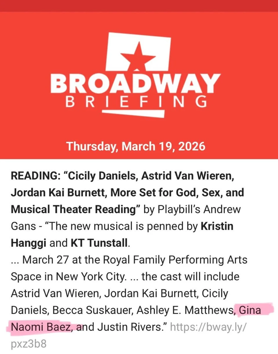 GOD, SEX AND MUSICAL THEATER Sunday, March 1, 2026 7:30 AM 07:30 Tuesday, March 31, 2026 8:30 AM 08:30 Google Calendar ICS Gina is taking on the role of Mother in the 29 hour reading of GOD, SEX AND MUSICAL THEATER by Kristin Hanggi and KT Tunstall.